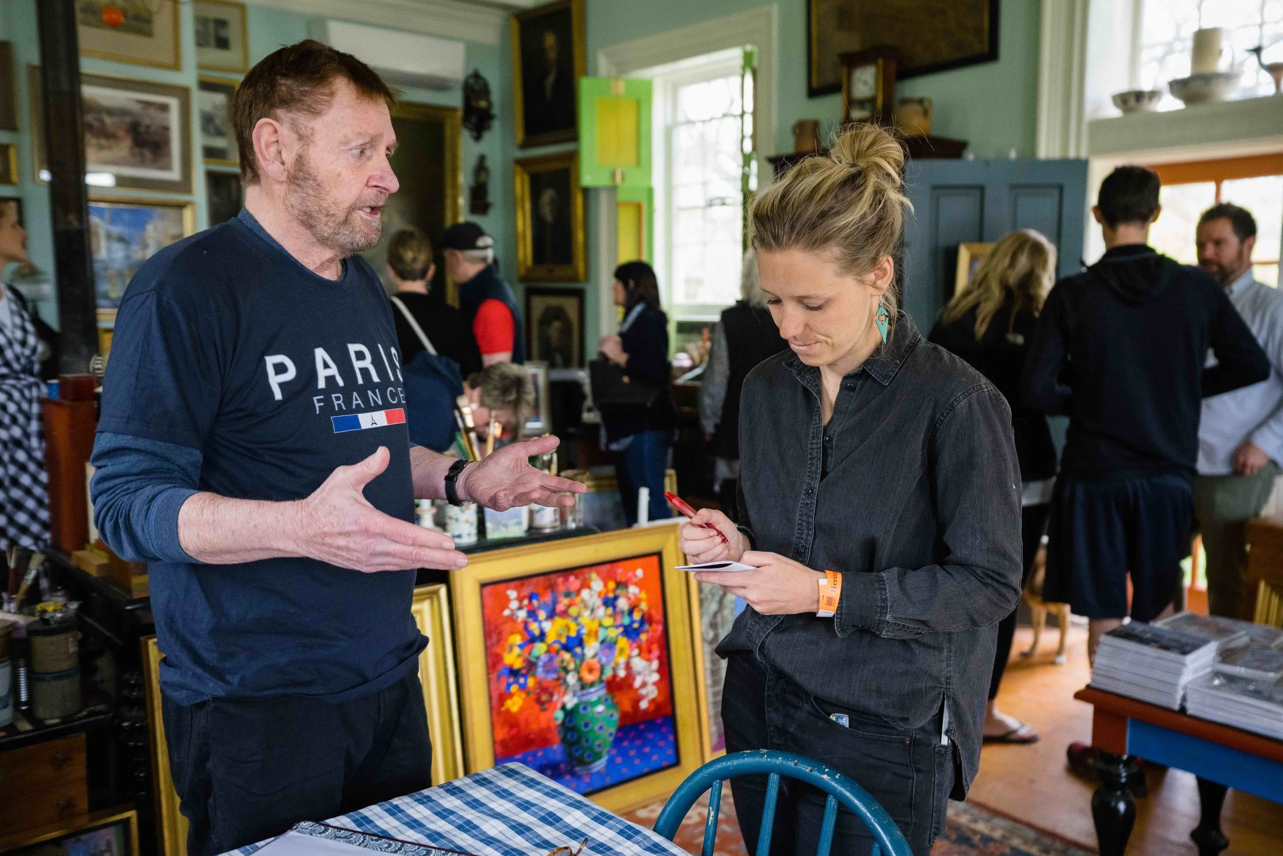 Rosie Gochnour Serago is pictured reading a book into a microphone outdoors during a presentation, with colorful artwork on an easel behind her and an audience in front of her.